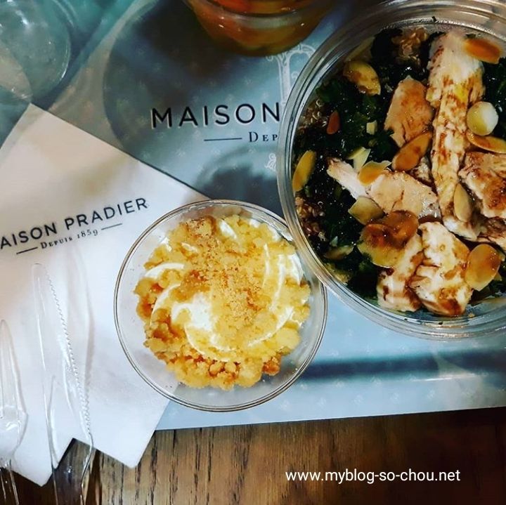 Si vous souhaitez déjeuner sur le pouce sans vous ruiner, je vous conseille les plateaux snacking de la Maison Pradier. Elle propose des formules avec un sandwich ou une salade, une boisson et un dessert, vous aurez l'embarras du choix. J'ai opté pour une salade de quinoa et une mousse légère comme un nuage en dessert. Non seulement c'était succulent mais en plus la quantité était largement suffisante.